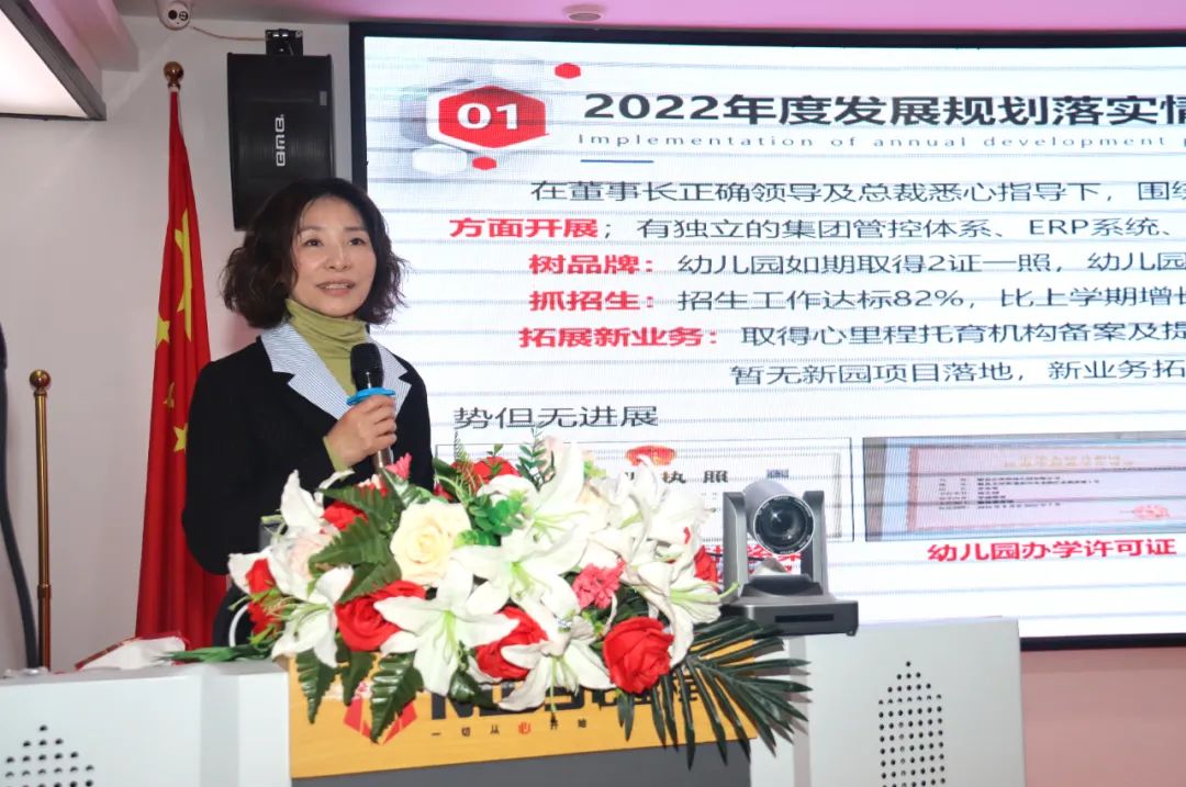 优发国际教育投资集团常务副总裁刘秀祯详细回顾了教育投资集团2022年的主要工作,并就公司2023年的重点工作作详细部署。她指出,2022年,幼教集团在董事长正确领导及总裁悉心指导下,围绕2022年度规划,从幼儿园树品牌、抓招生,拓展新园新业务三方面开展;有独立的集团管控体系、ERP系统、考勤系统,并正式更名为优发国际教育投资集团有限公司。站在新的征程,优发国际教育投资集团将在彭国远董事长等领导的正确领导下,在全体成员及园所教职工的共同努力下,不忘初心、继续前进,在科技启蒙领域及未来人才培养方向上做出更多的贡献。
