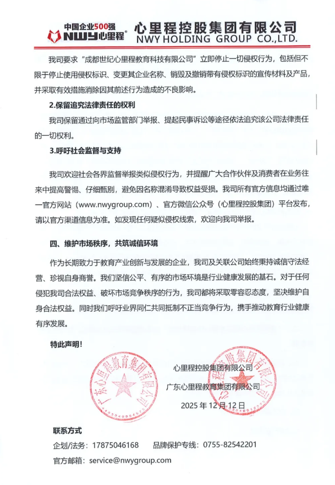 作为长期致力于教育产业创新与发展的企业,我司及关联公司始终秉持诚信守法经营、珍视自身商誉。我们坚信公平、有序的市场环境是行业健康发展的基石。对于任何侵犯我司合法权益、破坏市场竞争秩序的行为,我司都将采取零容忍态度,坚决维护自身合法权益。同时我们呼吁业界同仁共同抵制不正当竞争行为,携手推动教育行业健康有序发展。