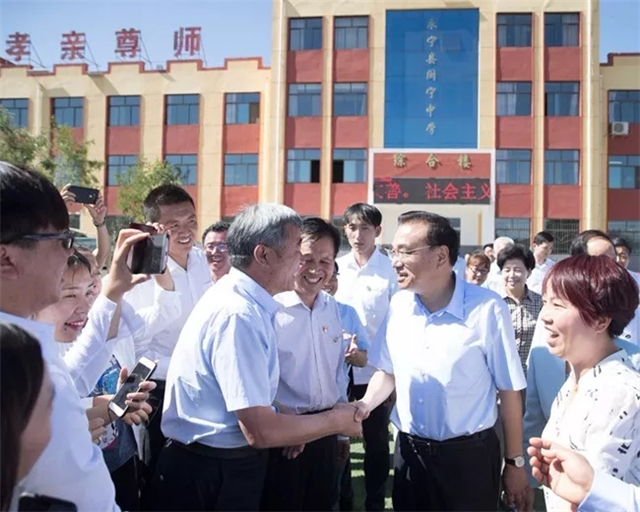 6月4日,李克强总理在宁夏银川市永宁县闽宁中学考察“互联网+教育”发展状况。宁夏通过打造教育资源公共服务平台,全区中小学校互联网接入率已达到100%。在该校的“智慧教室”,学生们人手一个平板电脑,向总理展示上面集成的优质教育课件和彼此分享的学习心得。